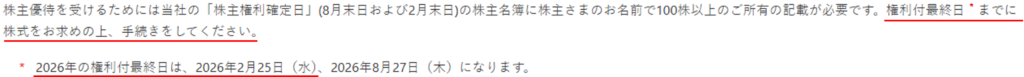 ステップ③:株主優待を受ける条件(権利付最終日・必要株数)を確認する